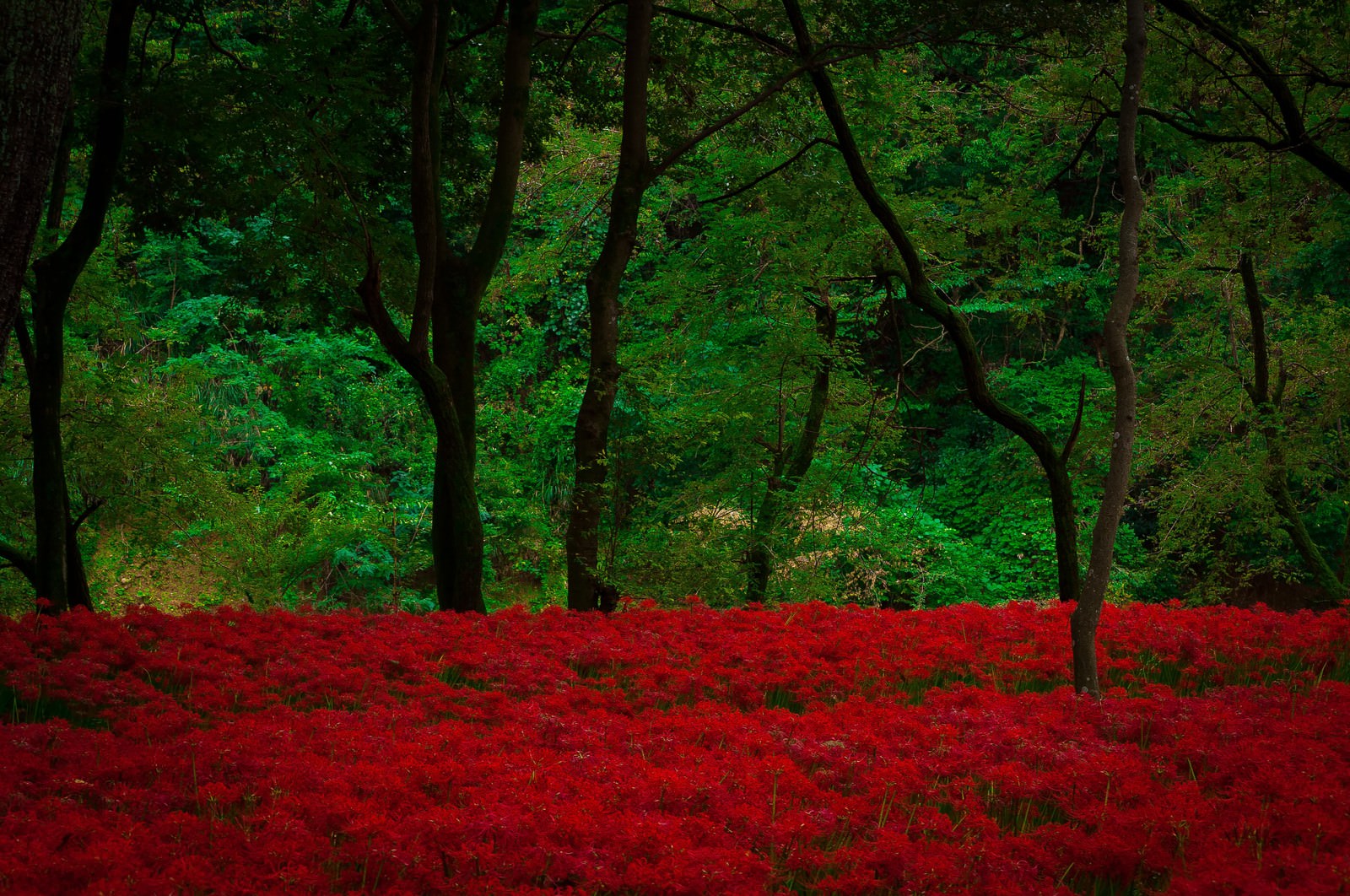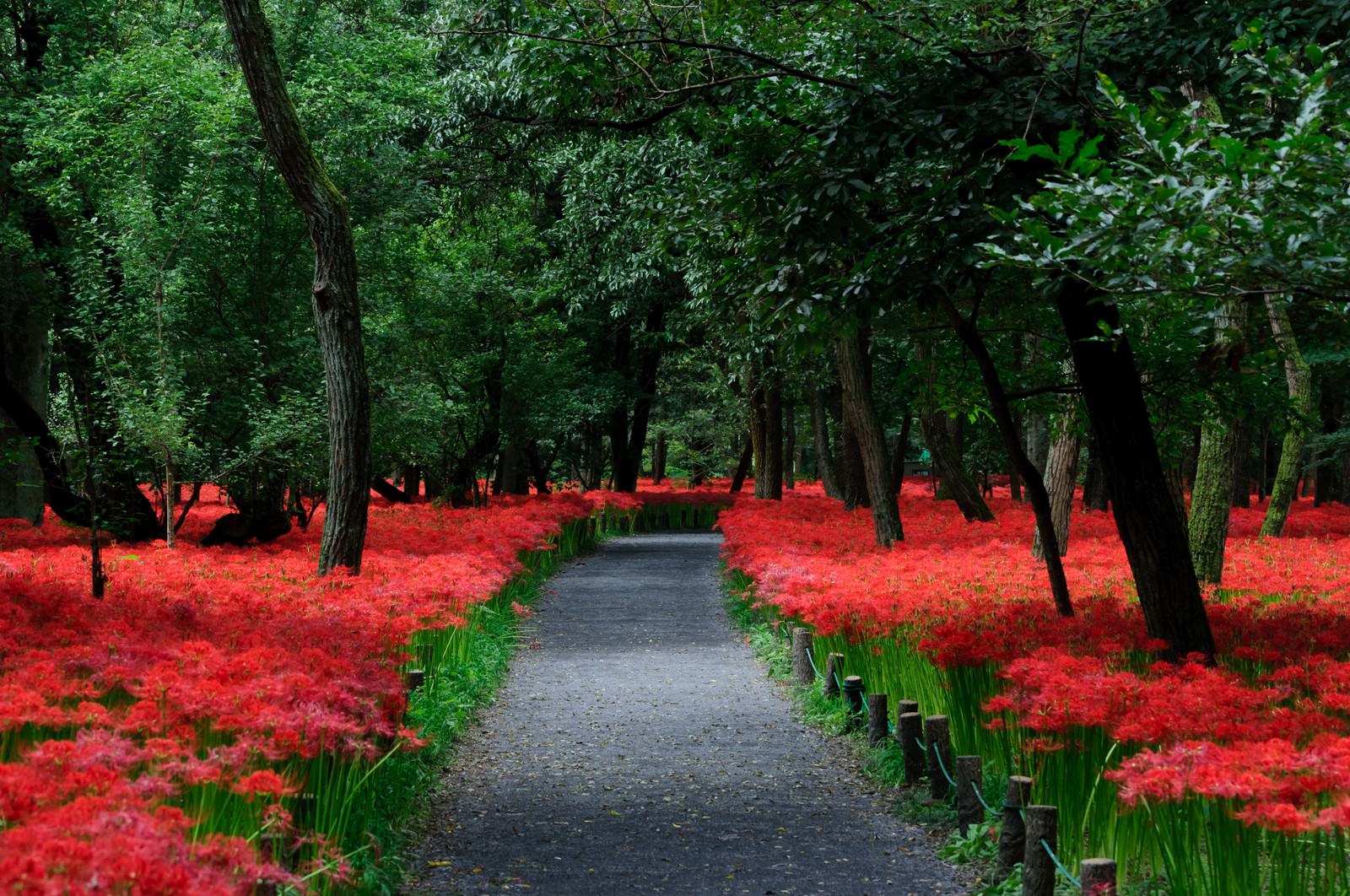 A silent crimson crowds the earth, blooming in clusters like a creeping flame. The Red Spider Lilies (Higanbana) softly announce the coming of autumn in a space untouchable by all. That red is not heat, but a deep, resonant stillness.